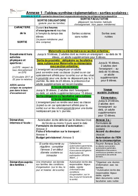 Dsden 82 Annexe 1 Tableau Synthèse Réglementation Des Sorties Scolaires